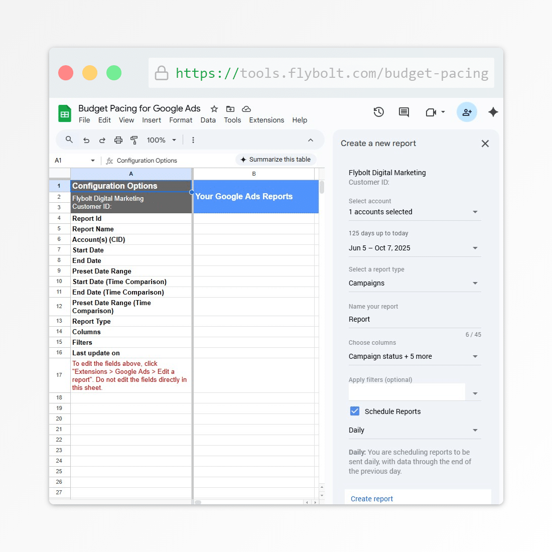 Connect your Google Ads account to Google Sheets and visualize how your campaigns are pacing against budget. With daily updates it’s a no-fuss way to monitor spend and avoid surprises.